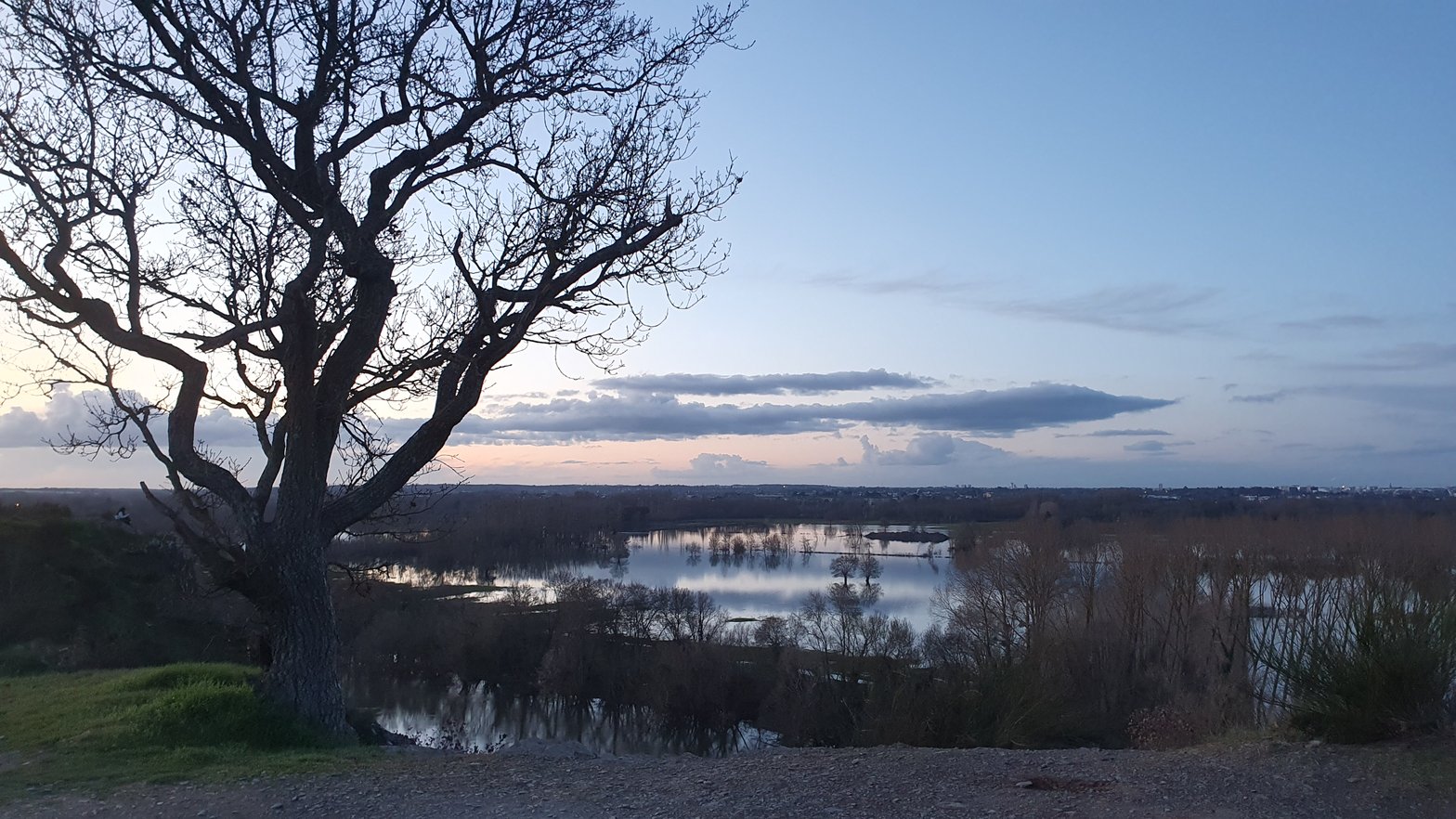 Je monte enfin le petit escalier pour arriver en haut des rochers et embrasse l’argent à perte de vue qui ne serpente pas simplement entre les arbres, comme d’habitude, mais occupe une grande partie de l’île en face, le stade et quelques rues aussi.