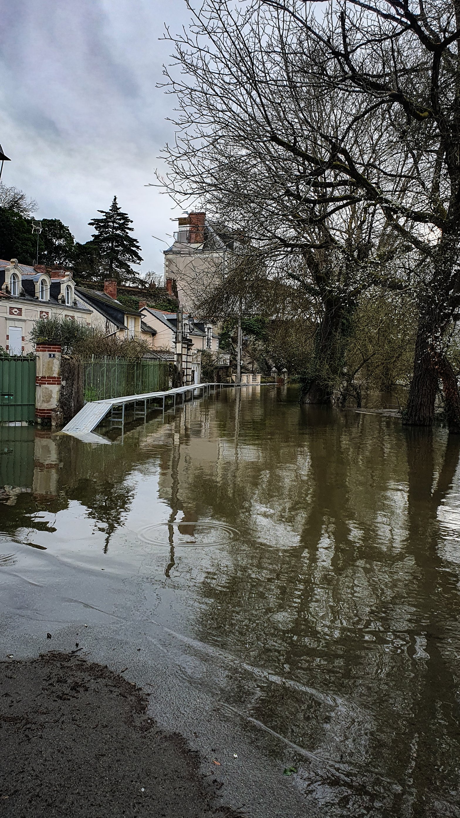 Je veux voir si l’eau est montée depuis lundi : je prends donc le chemin vers le Louet, qui est déjà sorti de son lit, enjambé la muraille pour s’étaler confortablement sur le chemin qui le longe de près.